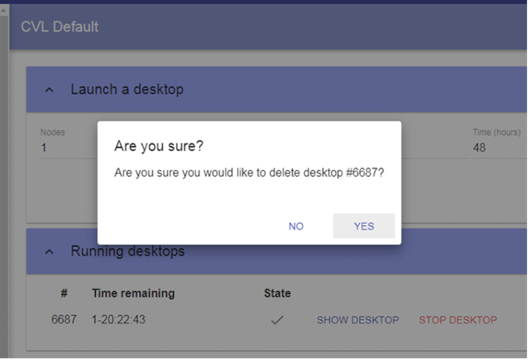 To stop your desktop return to the Strudel Web desktop management screen and select the red [STOP DESKTOP] button (Fig. 6 above item 4). You will be asked to confirm that you want to stop the desktop. Select [YES] to stop the desktop.
