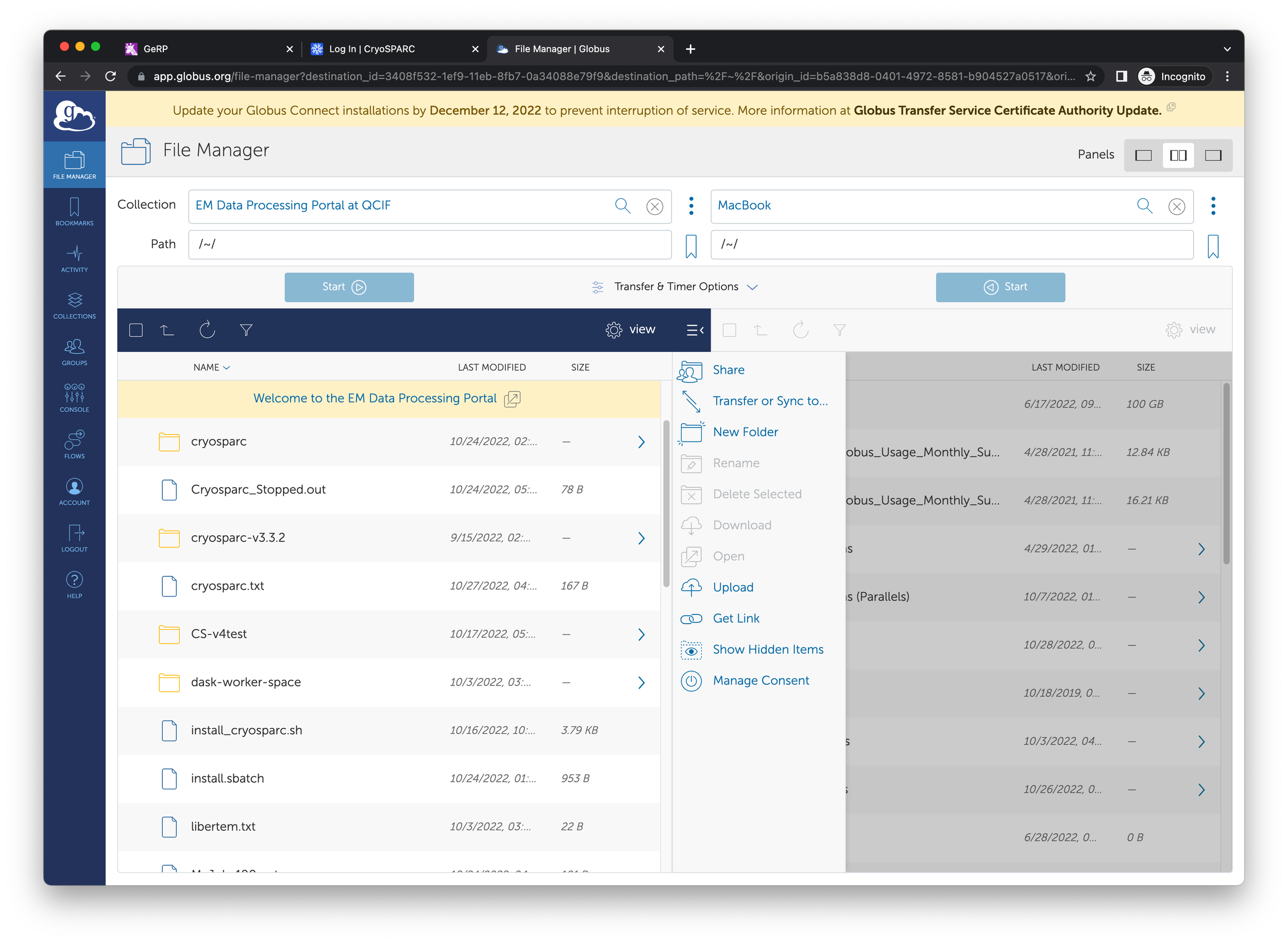 You receive an error when trying to access the ‘EM Data Processing Portal’ collection using Globus. Contact us.